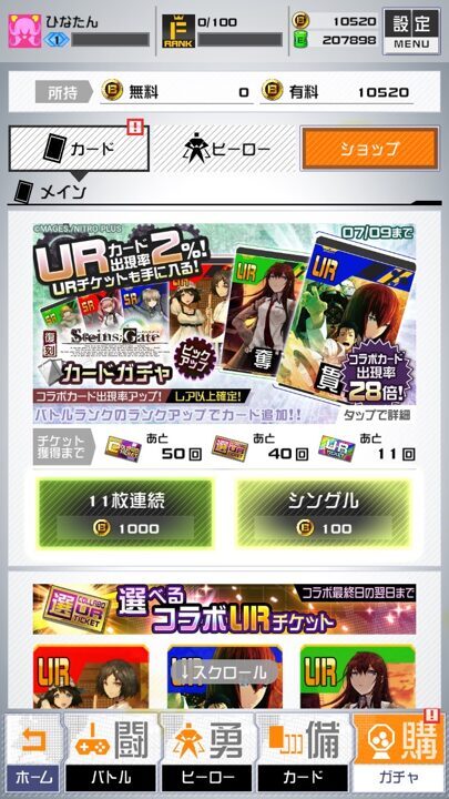 ガチャでカードを集めて強くしたり、好きなヒーローを解放したりできる。
