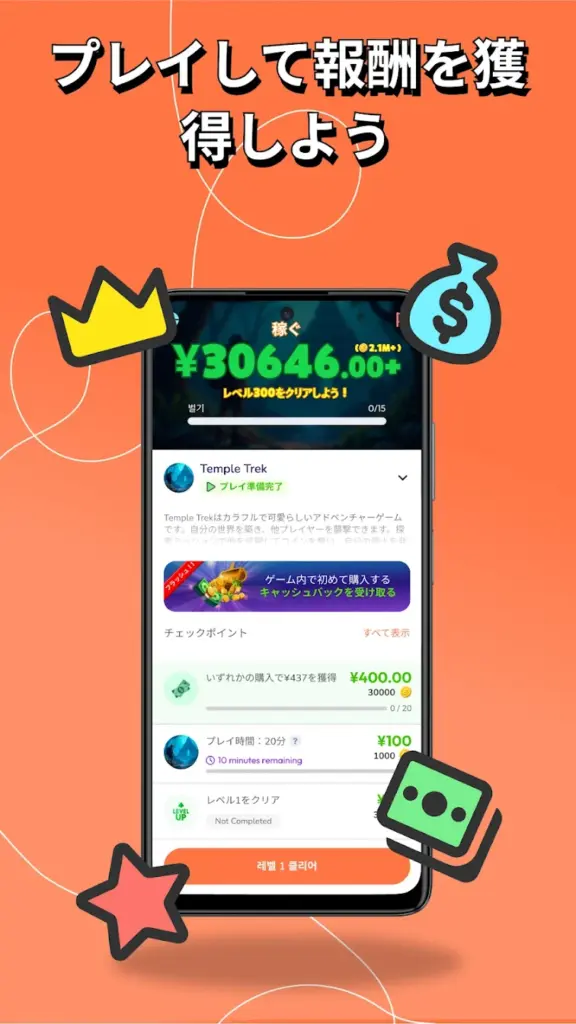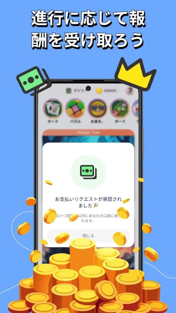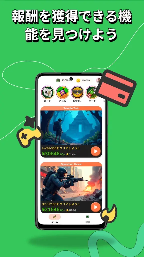 広告動画を見たり、カジュアルなミニゲームを遊んだり、アンケートに答えたりするだけでコインがもらえる仕組みになってるよ。