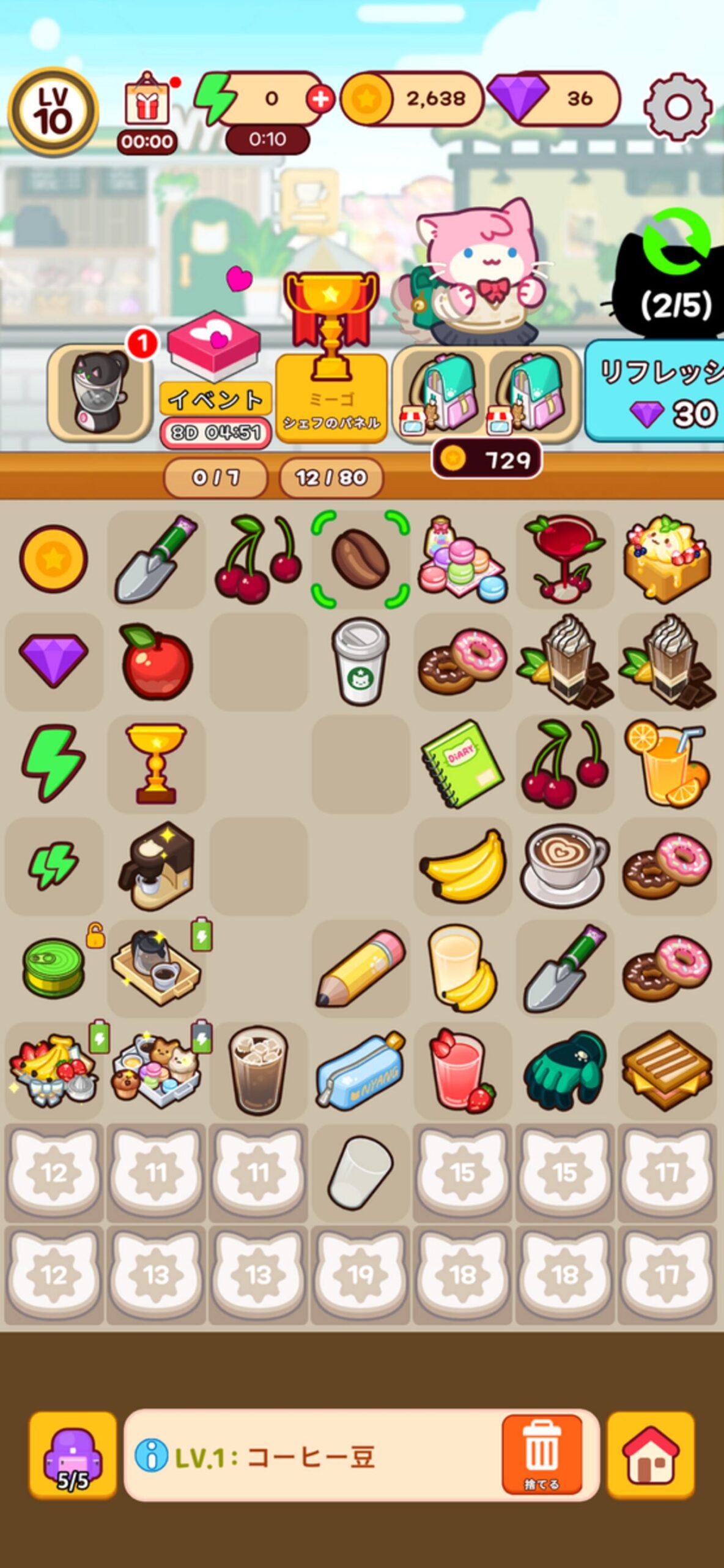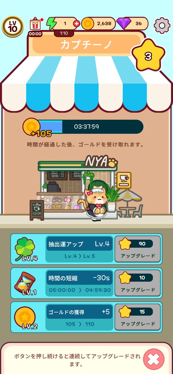 地道に続けることでカフェの設備も少しずつ整って、レアなねこたちが遊びに来てくれるようになるんだ。