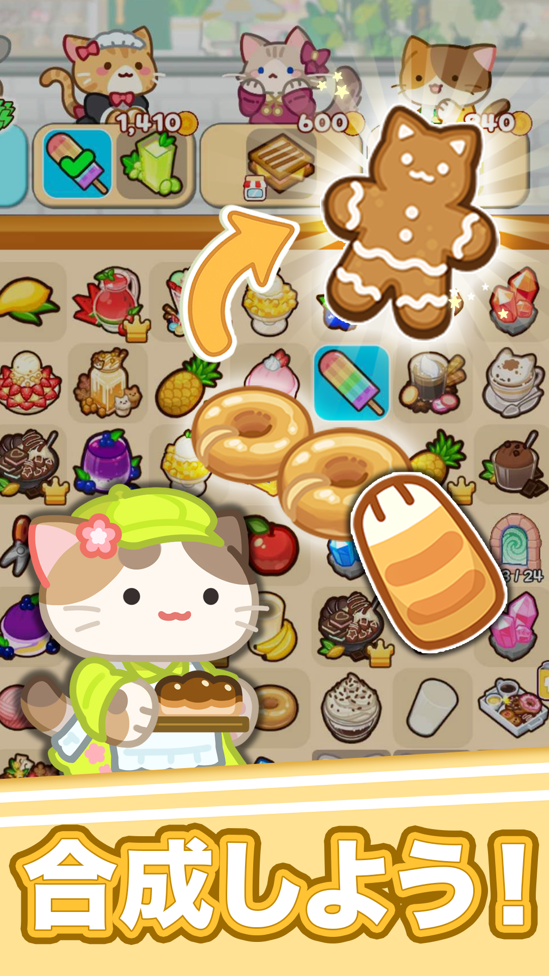 ゲームを進めると、新しいレシピやデコアイテム、ねこキャラがどんどん解放されていくよ。